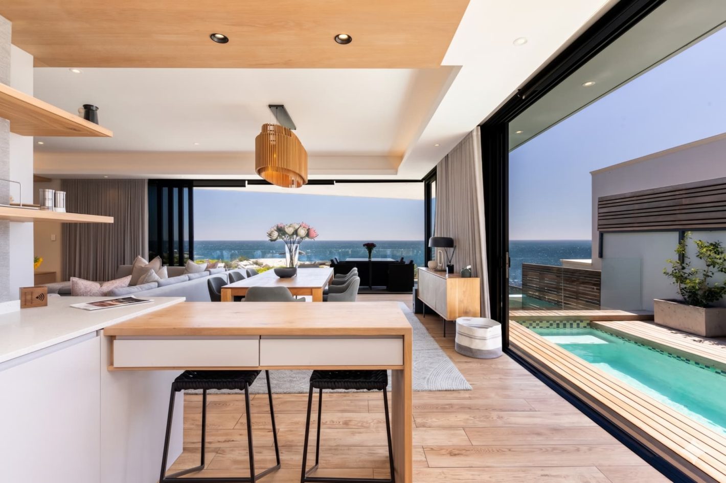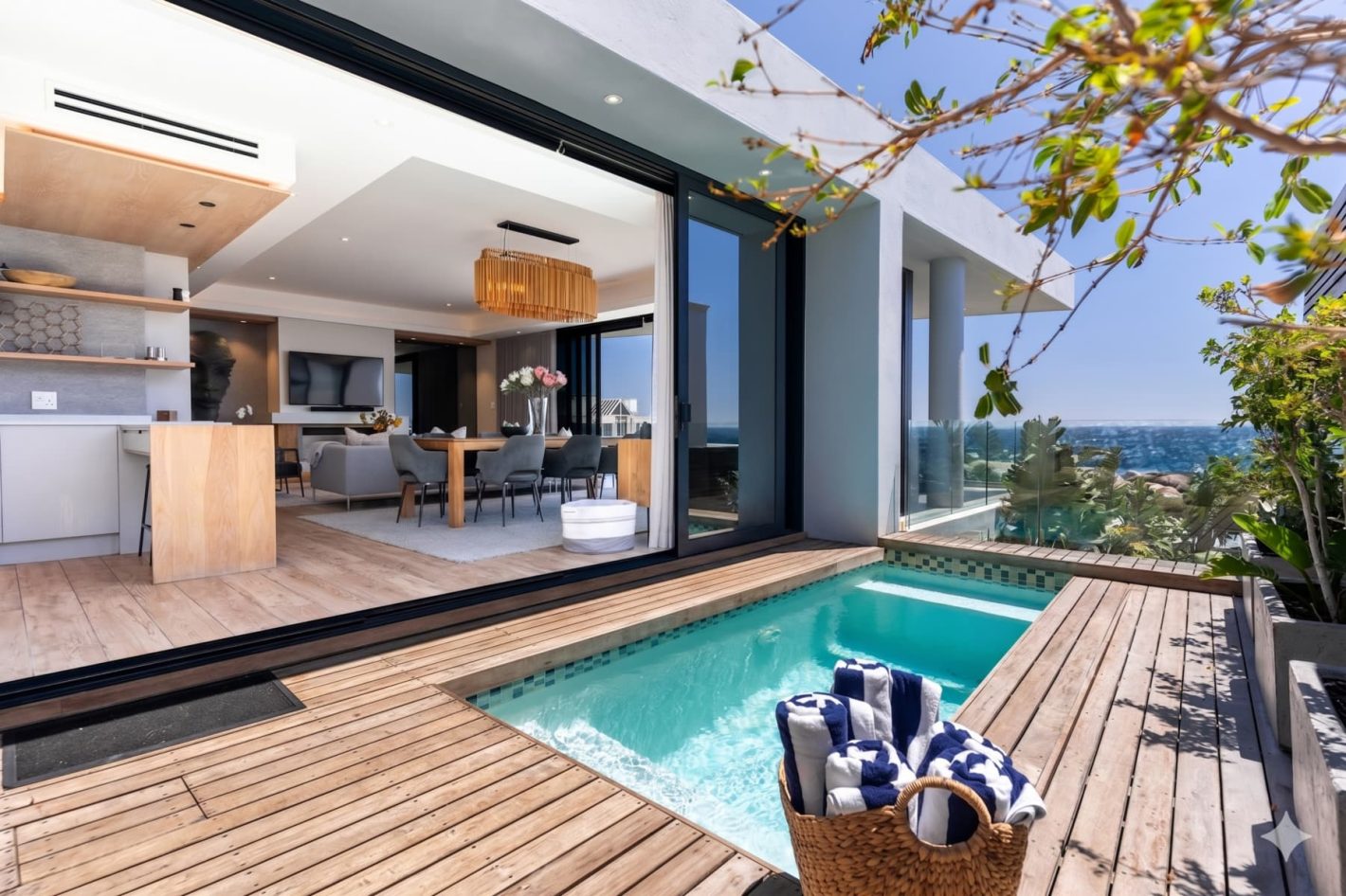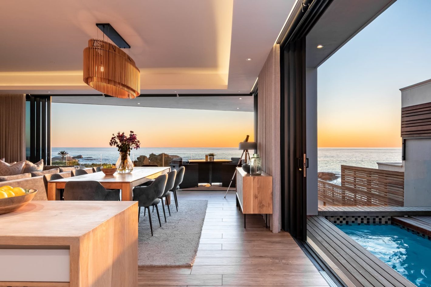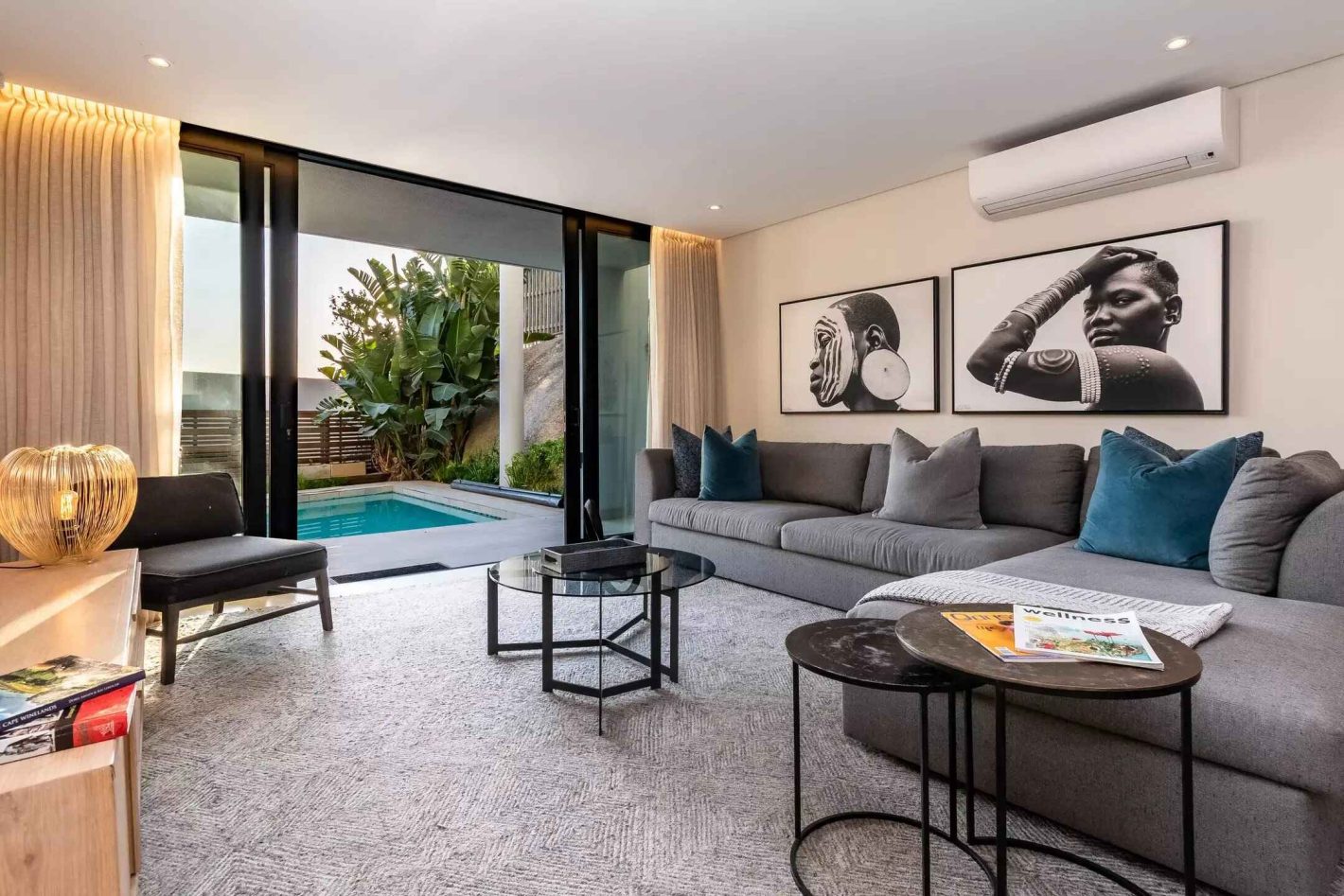 The upper level is the heart of the home, featuring a fully equipped kitchen, a spacious dining area, and a lounge. Expansive, wrap-around sliding doors open onto large balconies, revealing panoramic sea views and a private heated pool. This is the perfect setting for a sunset braai (BBQ) with a glass of champagne. The living room boasts a cinematic TV and a cozy fireplace, while a guest toilet provides additional convenience.