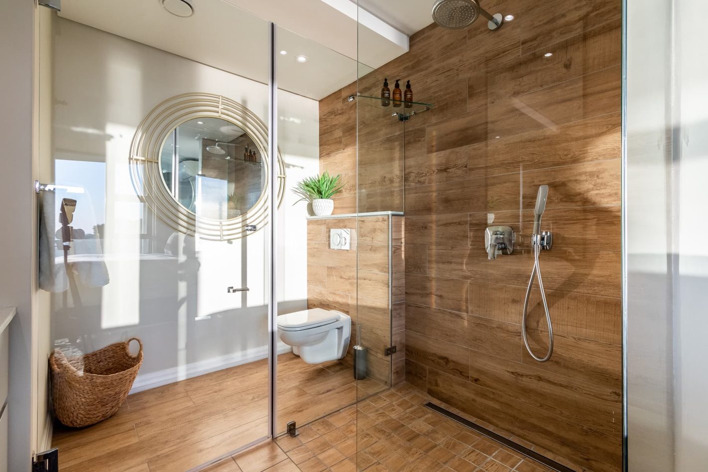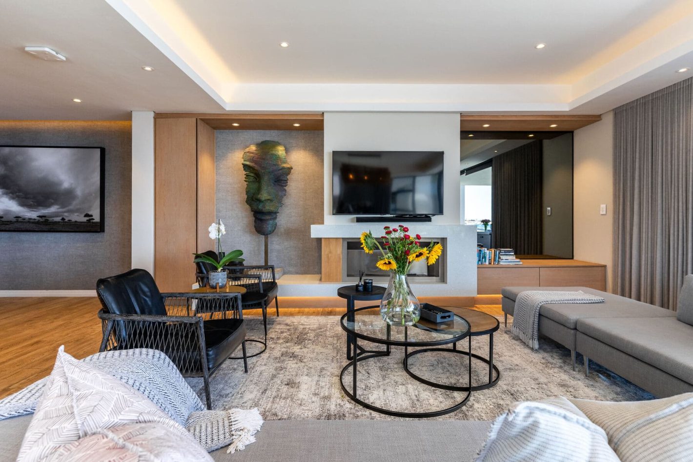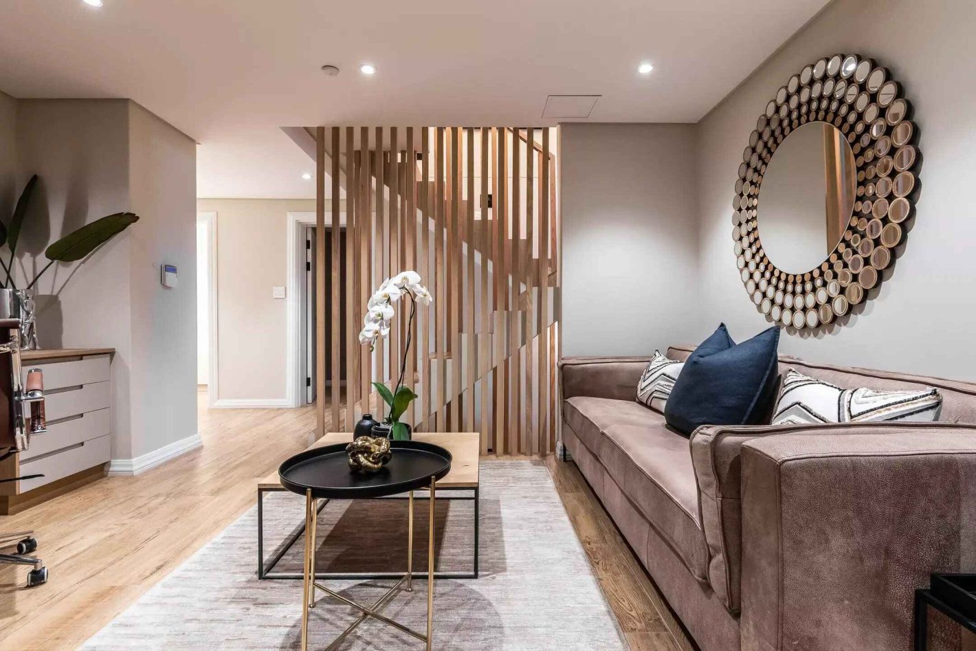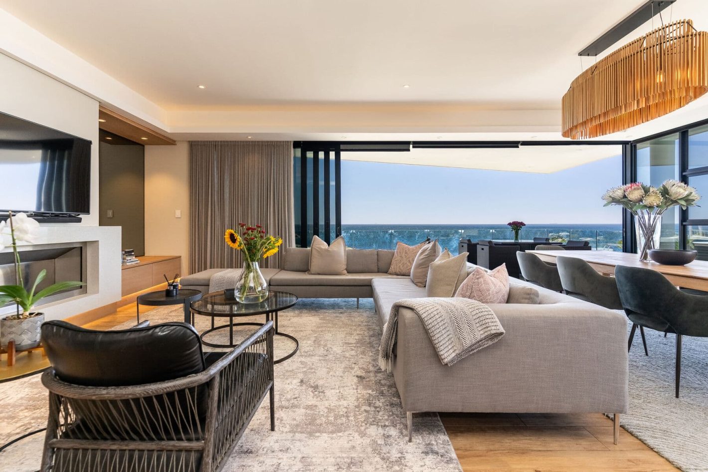 The upper level is the heart of the home, featuring a fully equipped kitchen, a spacious dining area, and a lounge. Expansive, wrap-around sliding doors open onto large balconies, revealing panoramic sea views and a private heated pool. This is the perfect setting for a sunset braai (BBQ) with a glass of champagne. The living room boasts a cinematic TV and a cozy fireplace, while a guest toilet provides additional convenience.