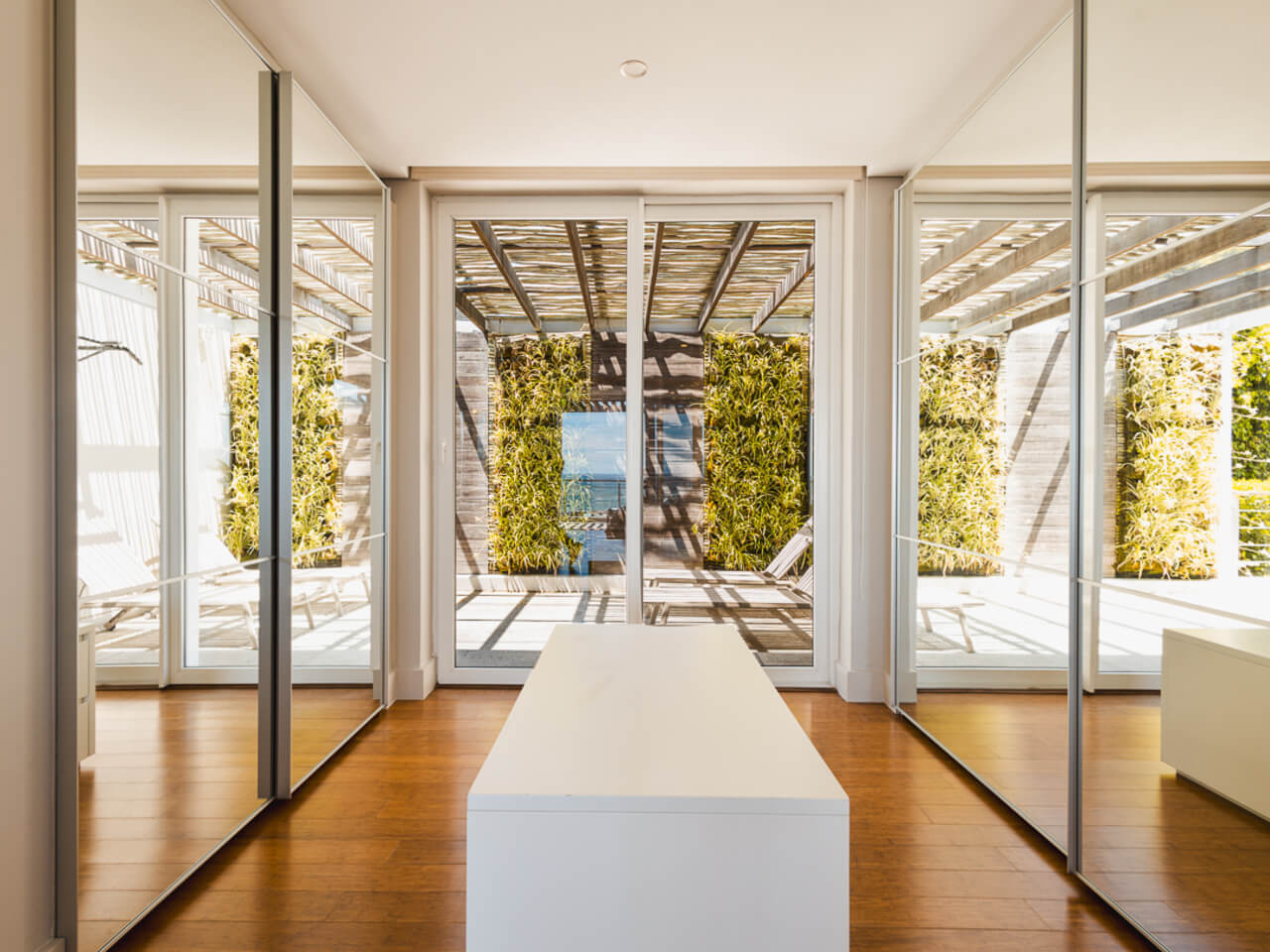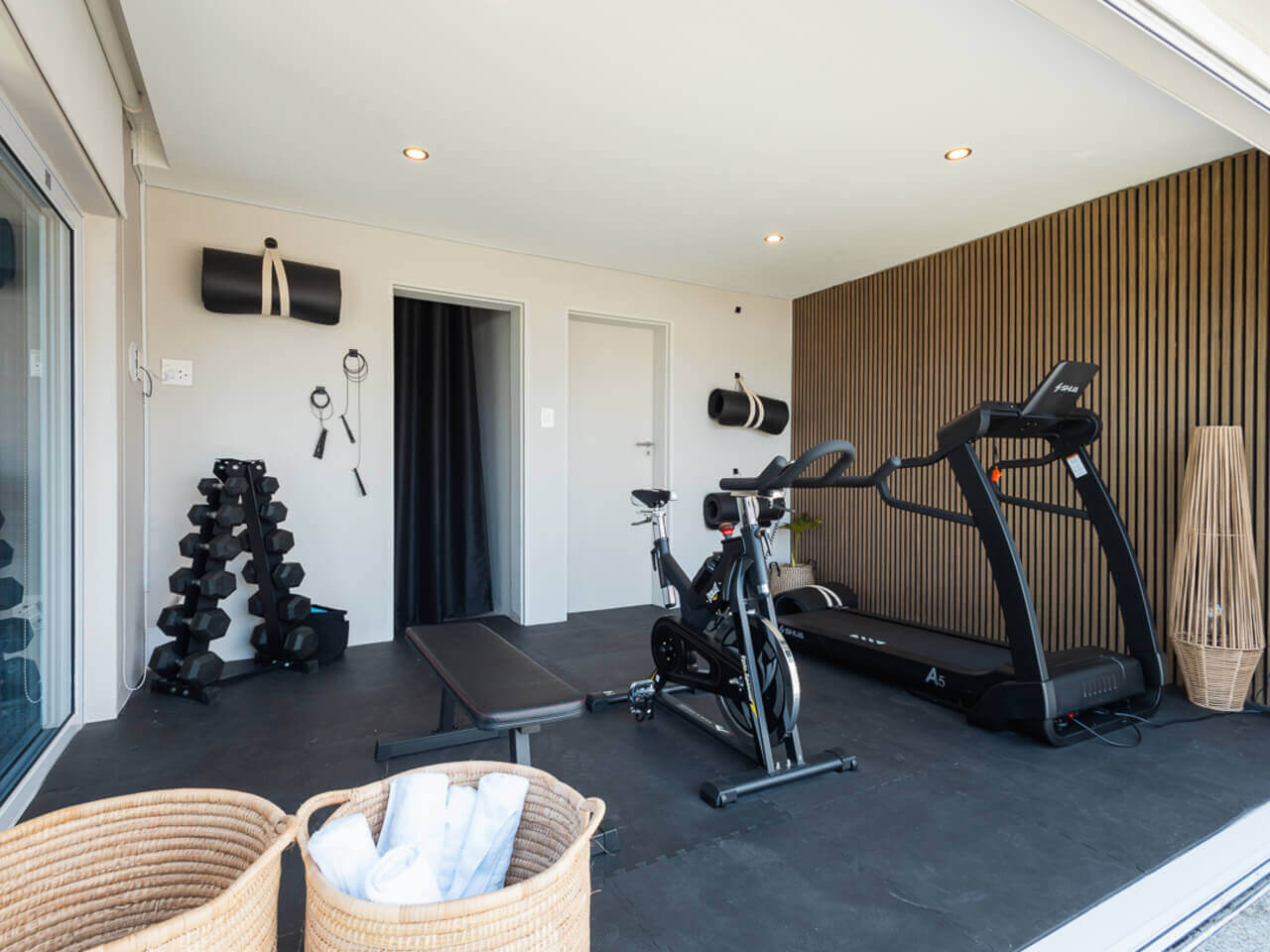 The outdoor area is your private oasis. The extensive garden is ideal for families, offering ample space for activity, while the outdoor patio provides an ideal spot for a barbecue. The large, heated pool area receives sun all day, complemented by sun loungers and umbrellas for ultimate relaxation. For those dedicated to fitness, a private gym is conveniently located downstairs.