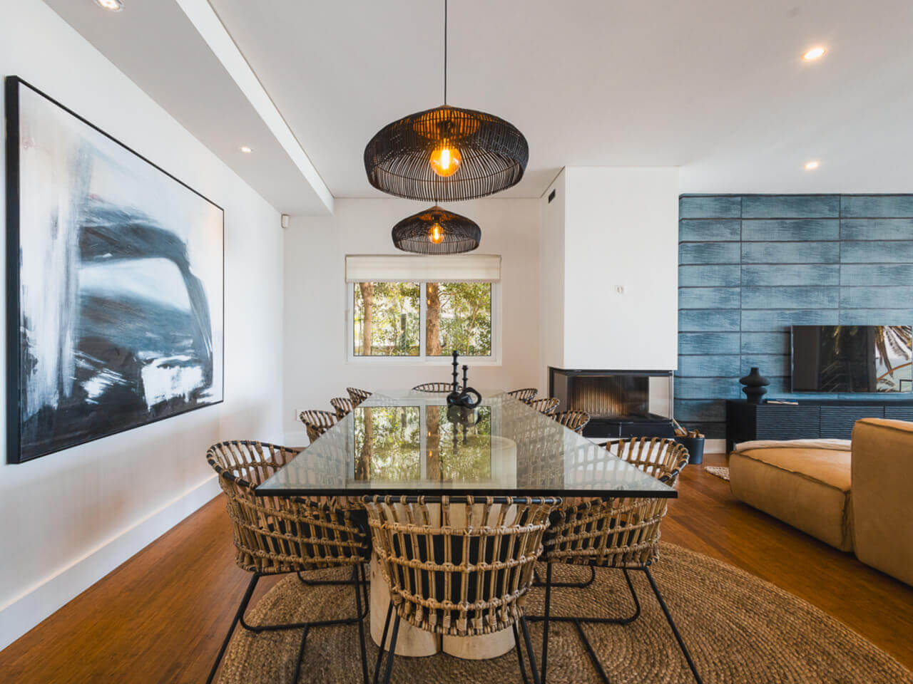 The villa’s first floor is designed for seamless entertaining, showcasing an open-plan kitchen and living area. The kitchen is fully equipped with high-end appliances, allowing you to prepare meals exactly as you would at home. The indoor lounge and TV room open directly onto the large outdoor patio, creating an expansive, connected space perfect for relaxing or hosting.