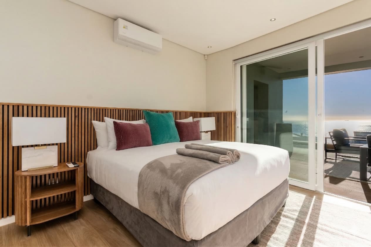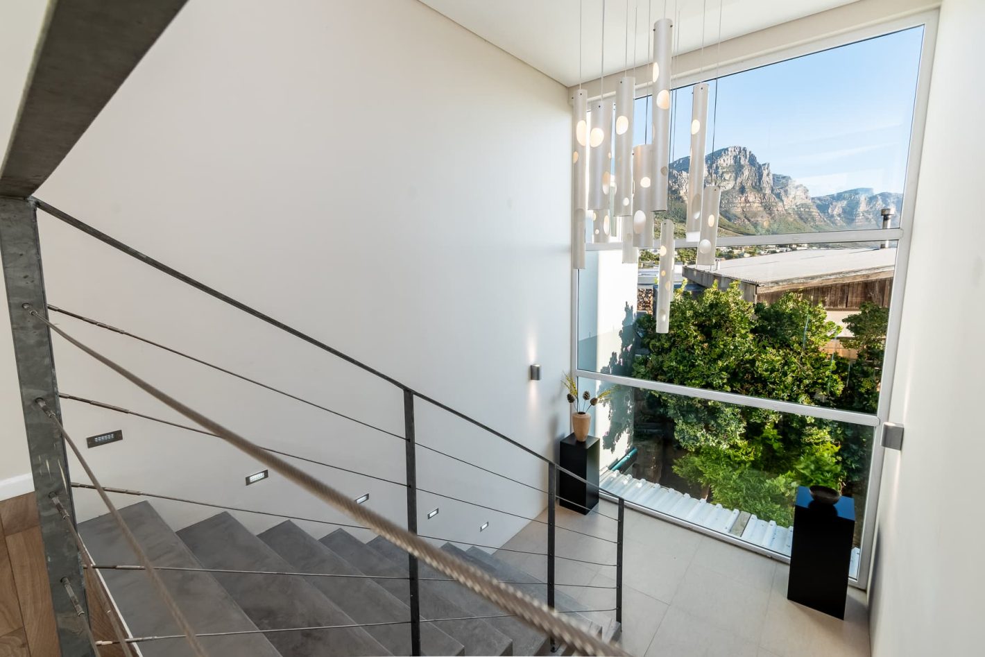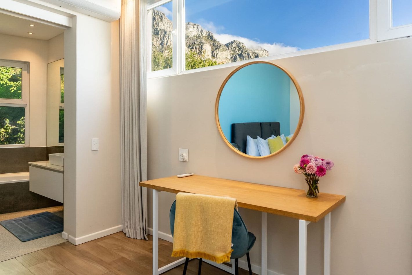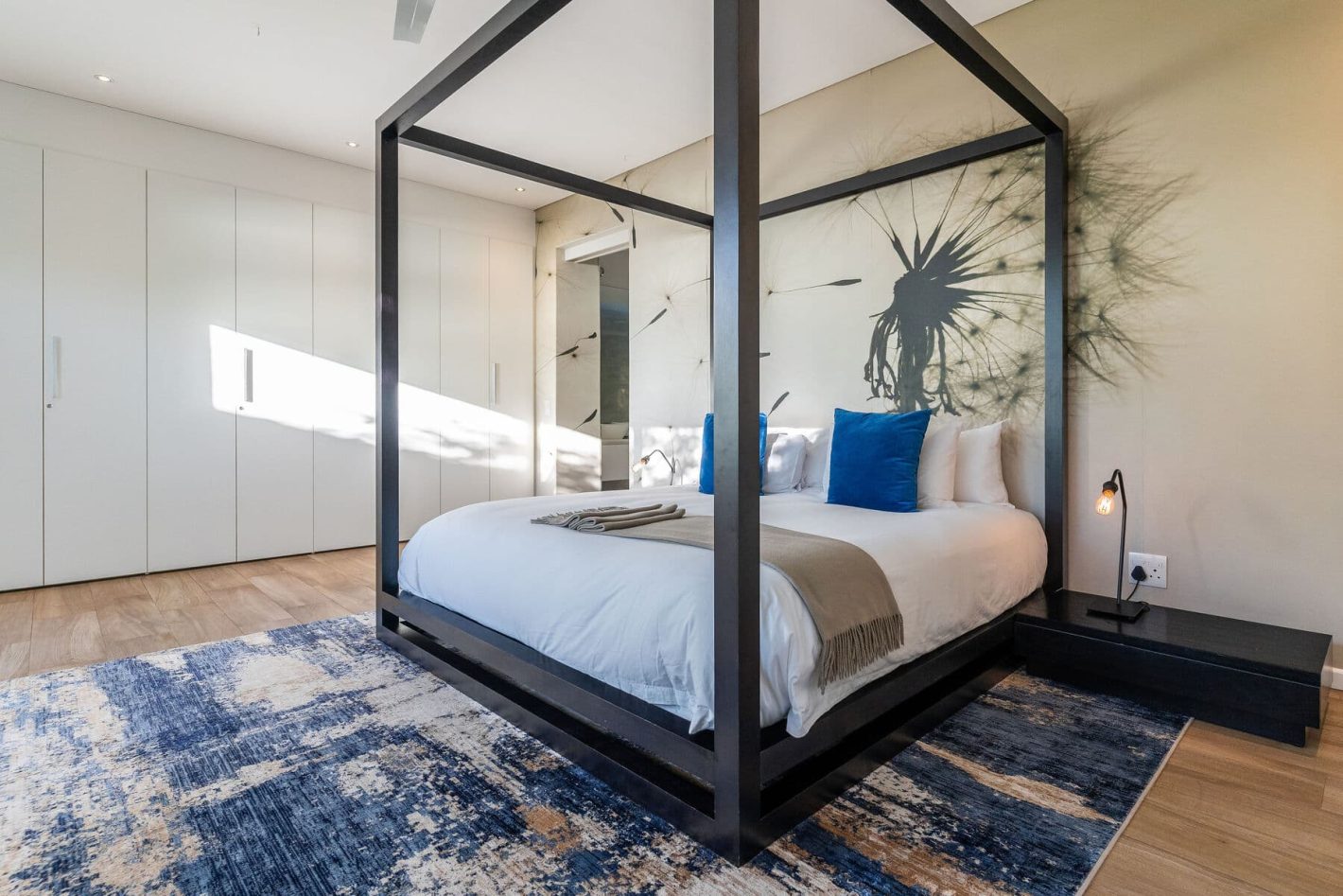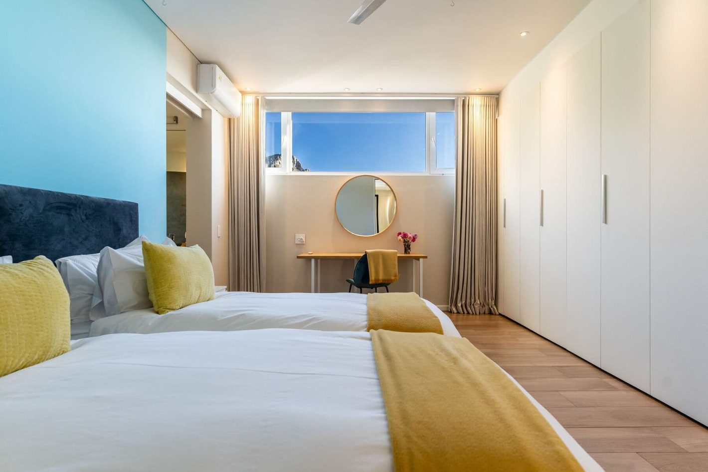 The main penthouse features four luxurious bedrooms. The upper level includes three en-suite bedrooms, each complete with a bath, shower, toilet, and basin. Two of these rooms offer direct access to private outdoor areas with stunning Table Mountain vistas. A fourth bedroom is located near the main penthouse entrance. The lower level (second floor) hosts the two additional self-contained apartments, each with a bedroom, kitchen/kitchenette, private bathroom with shower, and access to an outdoor patio with seating and a gas Weber braai, ensuring privacy and convenience for all guests.